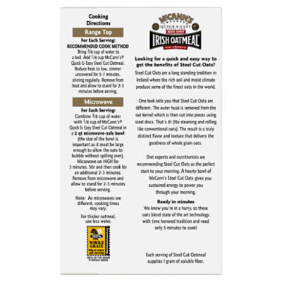 McCann's Steel Cut Irish Oatmeal - Shop Cereal & Breakfast at H-E-B McCann's Steel Cut Irish Oatmeal. 28 oz. $7.19 ($0.26/oz) Product description. For over 150 years, McCann's has been warming the hearts, minds and souls of consumers with its classic Steel Cut Irish Oatmeal. Consumers from around the world can enjoy the rich texture and nutty flavor that is uniquely McCann's. Made from 100% whole grain ...